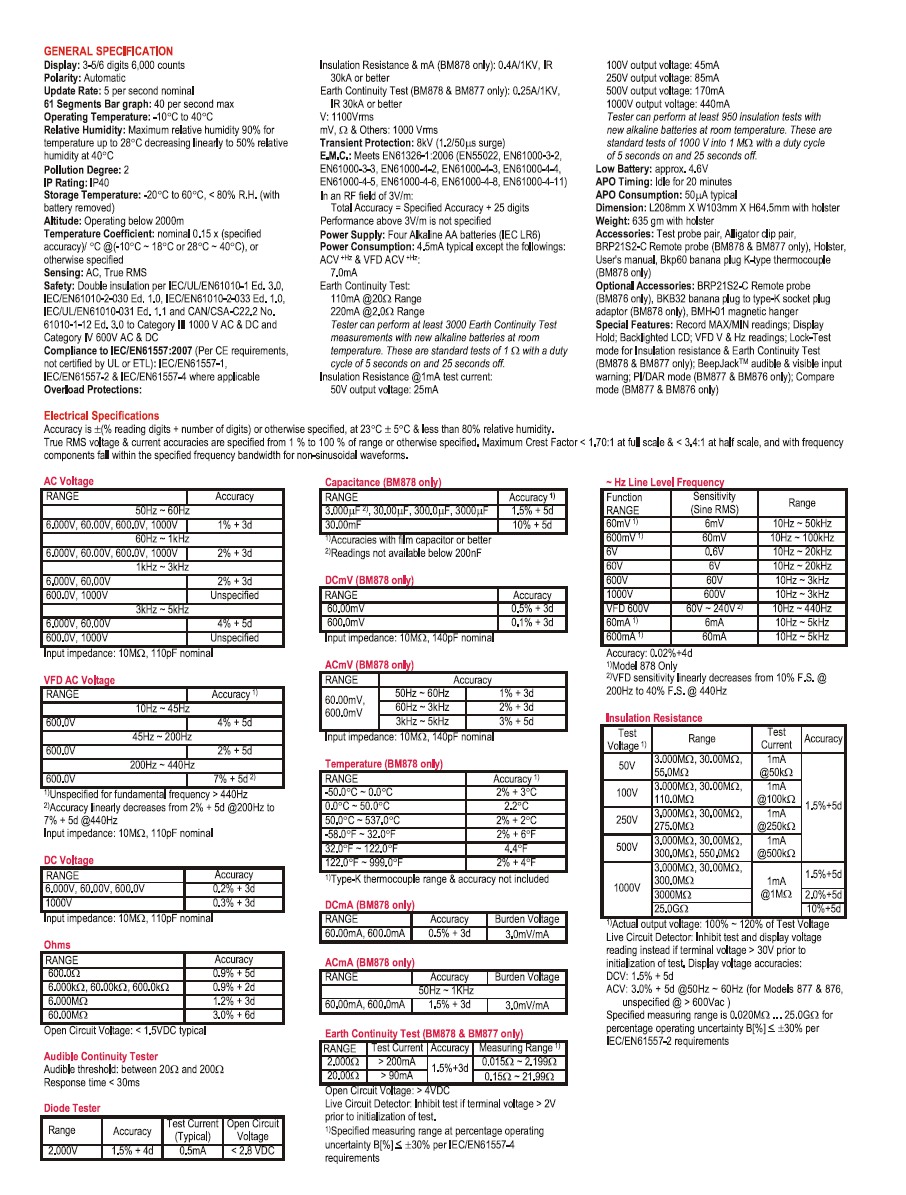 ≥ 90mA 輸出,20.00Ω 檔位 - PI(Polarization Index)& DAR(Dielectric Absorption Ratios) Features ─ 極化指數&介質吸收比:定時比測試,依間隔時間,能夠快速發現潮濕和污染絕緣的問題...(only BM878)